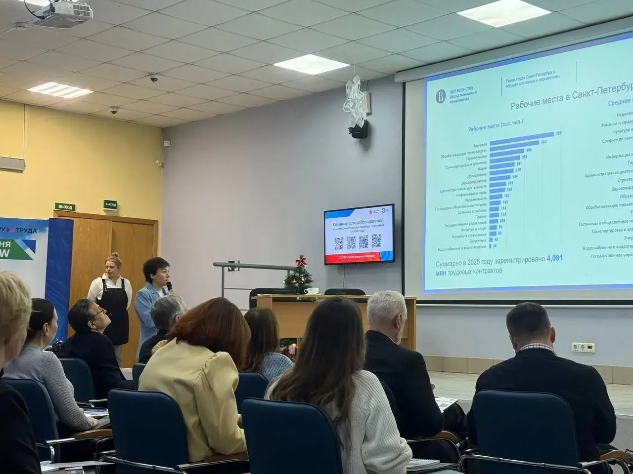 Об итогах работы Центра и ключевых направлениях деятельности на 2026 год рассказала заместитель директора Елена Попова. В ходе выступления работодателям был также представлен обзор текущего состояния и перспектив рынка труда Санкт-Петербурга. Особое внимание было уделено вызовам, с которым сталкивается рынок труда, статистике по числу рабочих мест, отраслям экономики и востребованным компетенциям.
