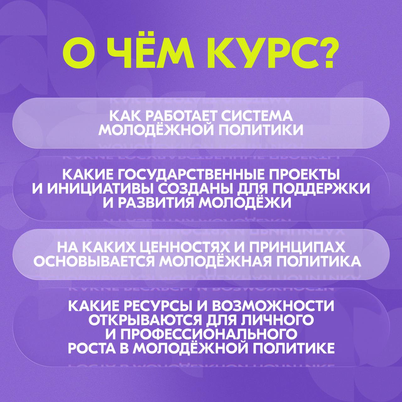 Курс состоит из пяти тем: «Ценности и смыслы молодёжной политики в России» посвящён приоритетам государства в отношении молодёжи и детей, роли Росмолодёжи и её задачах, стратегических документах и законодательных актах сферы молодёжной политики. Тема «Молодёжная политика и воспитание» – про акторов молодёжной политики и их работе с детьми и молодёжью. Тема «Ключевые организации в системе молодёжной политики, воспитания и просветительской деятельности» познакомит с деятельностью президентской платформой «Россия – страна возможностей», Российского общества «Знание» и АНО «ИРИ». Тема «Направления деятельности Росмолодёжи» расскажет об основные направлениях и проектах Росмолодёжи и как осуществляется их координация. Пятая тема – «Ключевые инструменты в сфере молодёжной политики» посвящена инструментам реализации молодёжной политики: от цифровых сервисов до деятельности общественных движений.